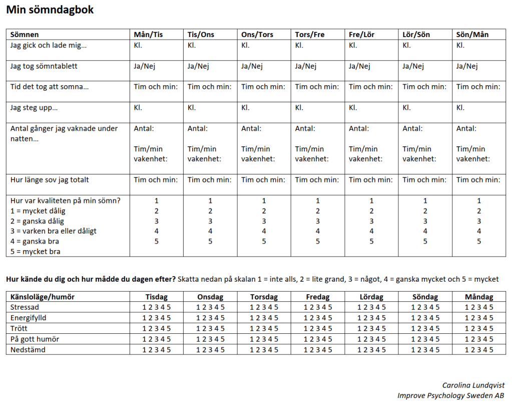 Att skriva sömndagbok är ett sätt att få en bättre bild av hur du egentligen sover. Det kan också ge dig viktiga ledtrådar till varför du ibland sover bättre eller sämre. Att föra sömndagbok ger dig möjlighet att utvärdera om de strategier du använder dig av för att sova fungerar för dig. Ett enkelt sätt att föra sömndagbok är att anteckna exempelvis vilken tid du gick och lade dig, hur lång tid det tog att somna och vilken tid du vaknade och steg upp på morgonen. Du kan även skriva upp om du vaknade under natten och i så fall hur ofta och hur du kände dig under dagen efteråt. Ofta är det enklast att fylla i sömndagboken direkt på morgonen. En enklare sömndagbok kan se ut så här: